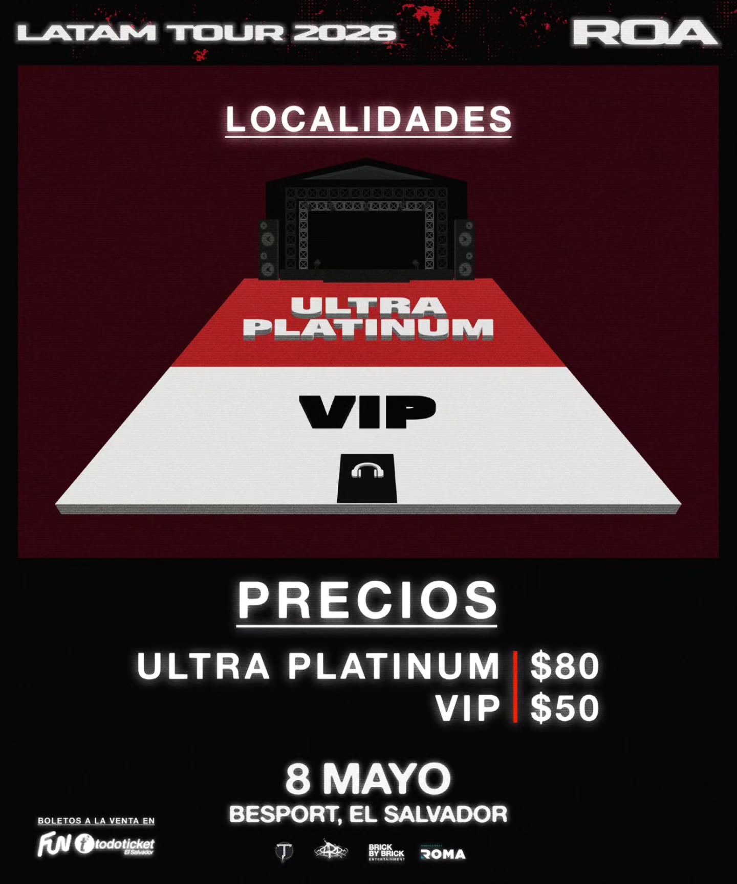 « Todos los Eventos ROA mayo 8, 2026 @ 8:30 pm - mayo 8, 2027 @ 11:30 pm « Natanael Cano Sebastian Yatra » LOCALIDADES UBICACIONES COMPRAR Añadir al calendario Google Calendar iCalendar Outlook 365 Outlook Live Detalles Comienza: mayo 8 @ 8:30 pm Finaliza: mayo 8, 2027 @ 11:30 pm Web: https://roa.funcapital.com/ Organizador Producciones Roma Ver la web Organizador Local BeSport MP3F+X68, Nueva 2,31 km, Nuevo Cuscatlan CP 1513 El Salvador